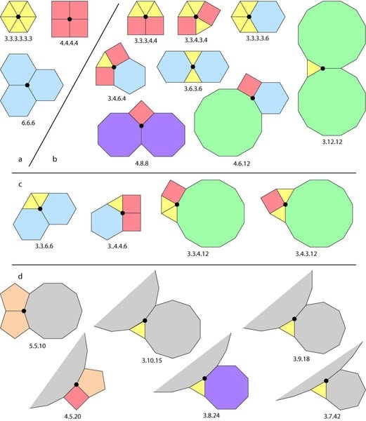4. Wszystkie 21 konfiguracji wierzchołkowych z wielokątów foremnych - podzielone ze względu na sposób występowania